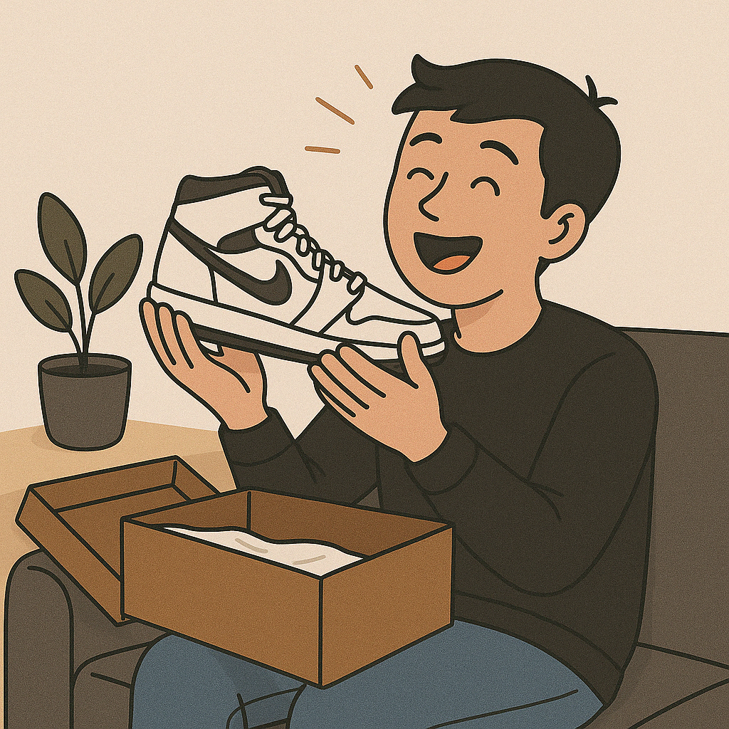 Het moment waar je op hebt gewacht: jouw nieuwe sneakers zijn gearriveerd! Na alle zorgvuldige controles en verzending is het tijd om te genieten van je aankoop. Trek ze aan, bewonder ze, en rock ze met trots – helemaal legit, helemaal van jou.